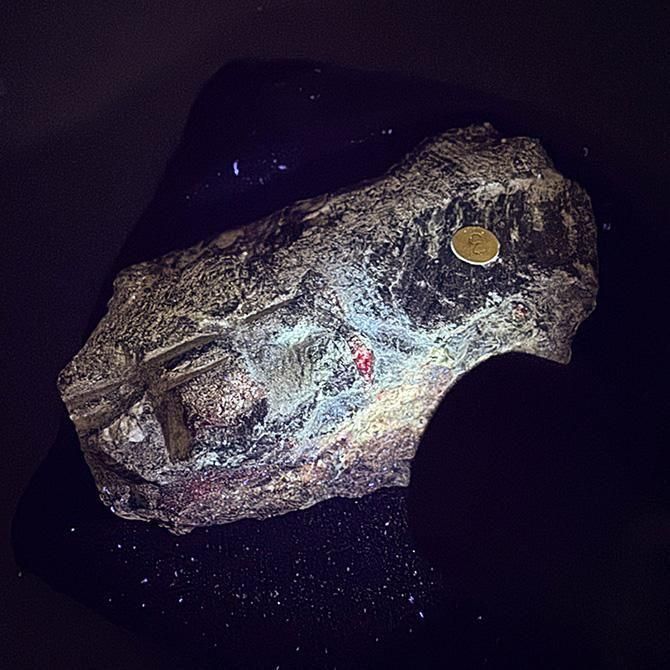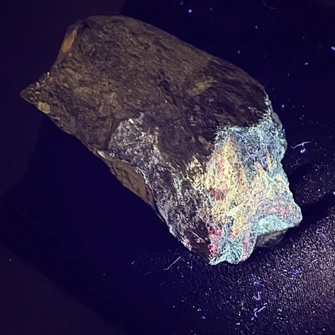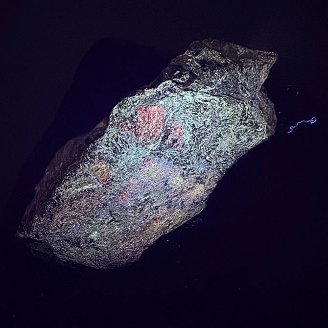 この石も緑っぽい部分が蛍光っぽい赤色に変色しますが、変色を見るためにはより強い光源が必要です。