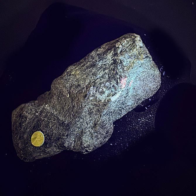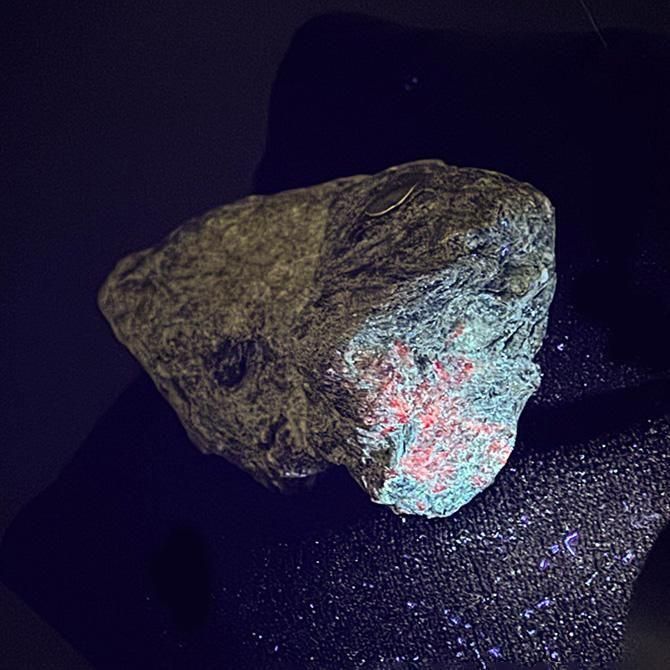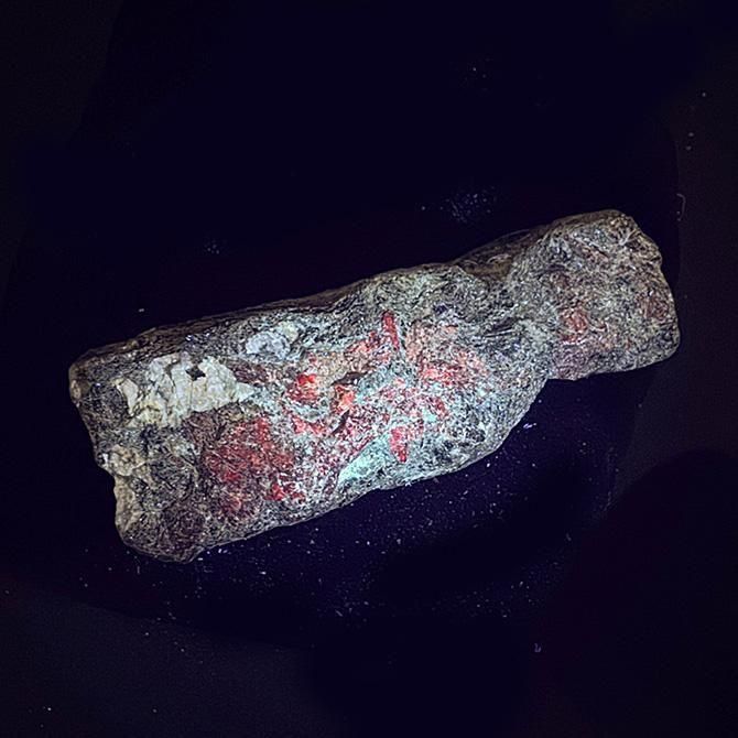この石も緑っぽい部分が蛍光っぽい赤色に変色しますが、変色を見るためにはより強い光源が必要です。