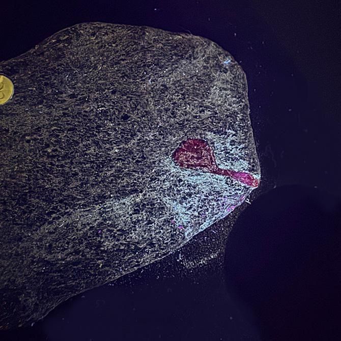 この石も緑っぽい部分が蛍光っぽい赤色に変色しますが、変色を見るためにはより強い光源が必要です。