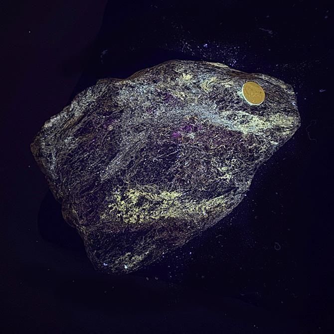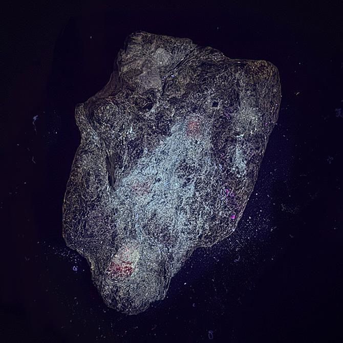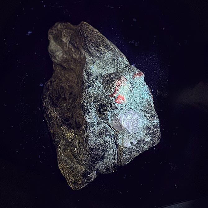 この石も緑っぽい部分が蛍光っぽい赤色に変色しますが、変色を見るためにはより強い光源が必要です。