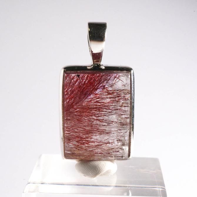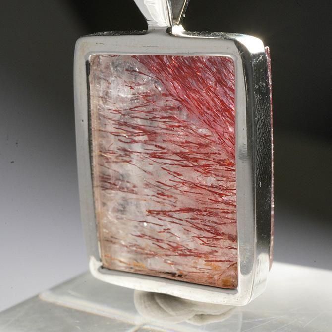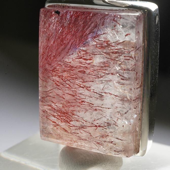 レピドクロサイトが多めのルースです。下方にカコクセナイト、水晶部分にアメジストも見られます。
